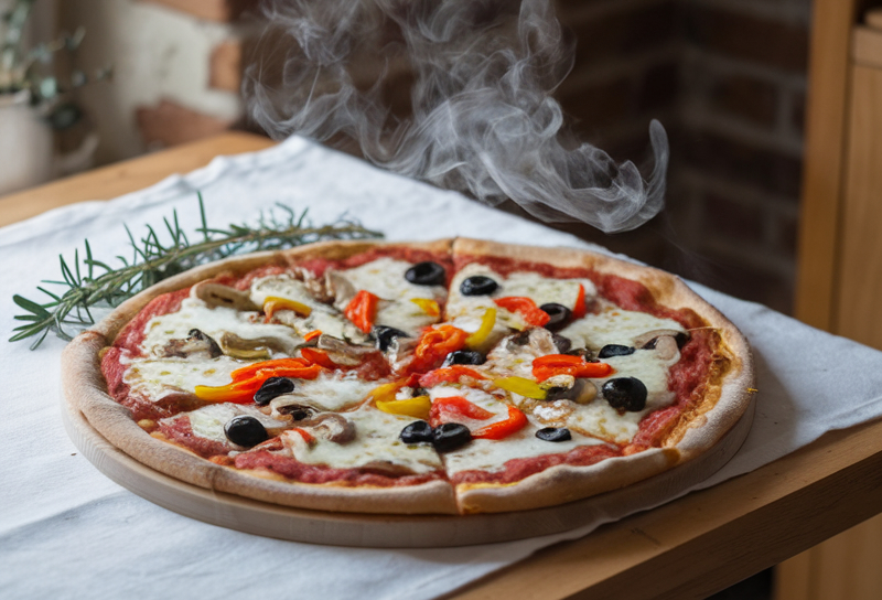 Состав: тесто дрожжевое, сыр моцарелла, ветчина, грибы шампиньоны, сыр, кетчуп