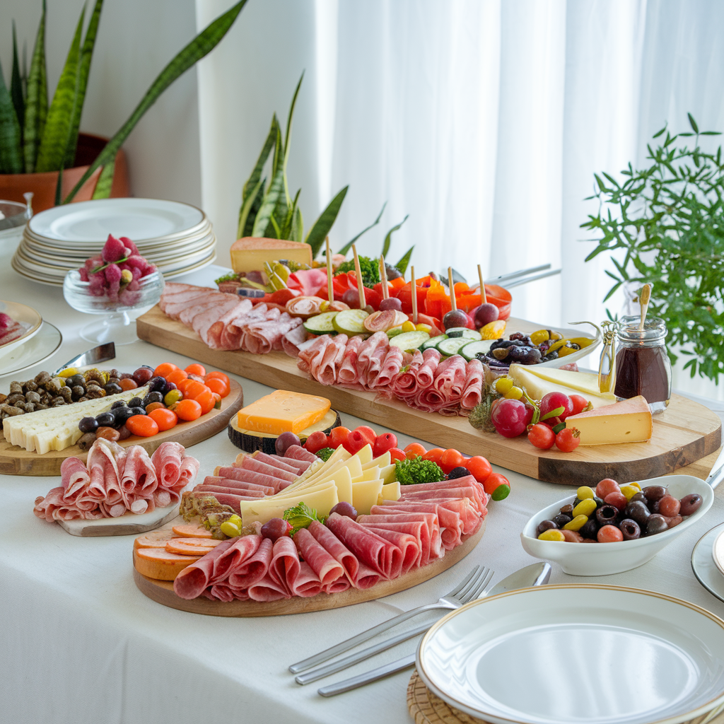 Состав: рулет куриный, язык говяжий, буженина, горчица, хрен, зелень