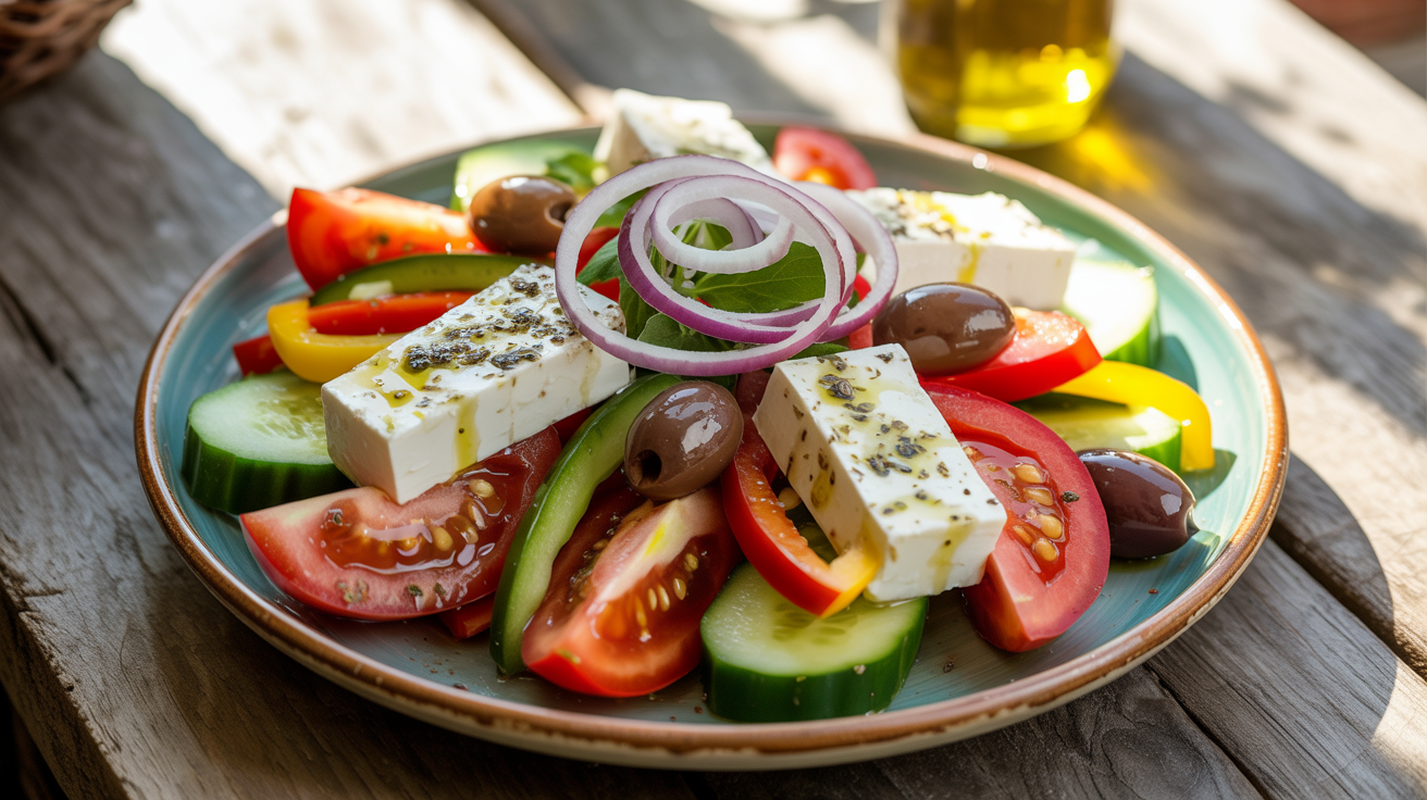 Состав: томат свежий, огурцы свежие, перец болгарский, сыр брынза, лук красный, масло оливковое, оливки/маслины, зелень