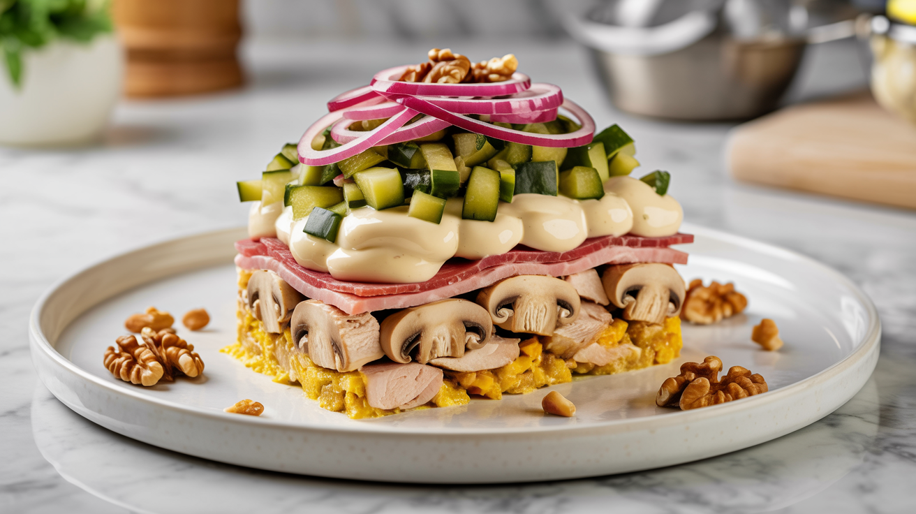 Состав: филе куриное запеченное, грибы шампиньоны, карбонад в/к, майонез, огурцы маринованные, лук красный, орех грецкий, сыр
